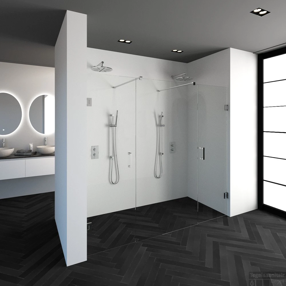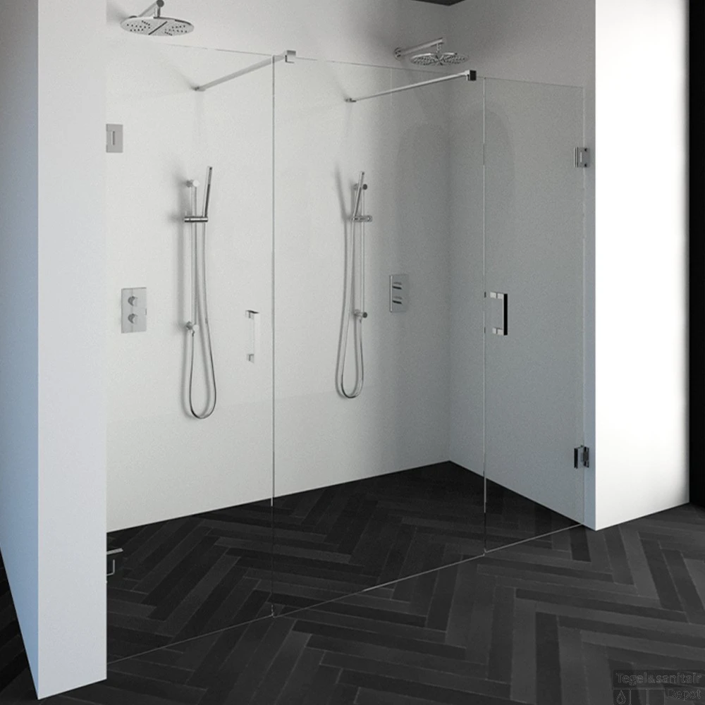 Deze complete niscabine bestaat uit een vrijstaande doorloopwand met twee draaideuren met Chroom beslag. Inclusief glasbehandeling en optionele kunststof profielen. De hoogte van de niscabine is 200 cm. Deze niscabine is modern straalt luxe uit door zijn design en kleur.
