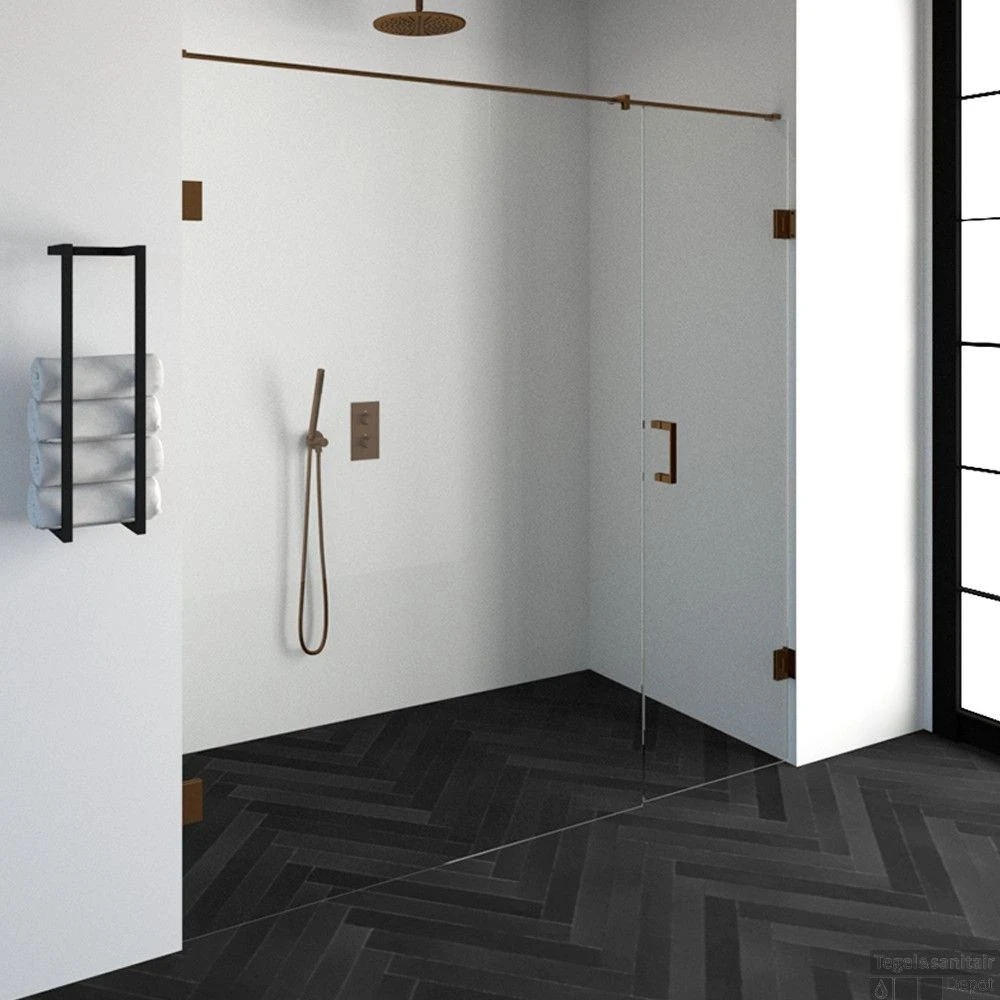 Deze complete nisdeur bestaat uit een inloopwand en draaideur met koper beslag. Inclusief glasbehandeling en optionele kunststof profielen. De hoogte is 200 cm. Deze nisdeur straalt luxe uit door zijn design en kleur.