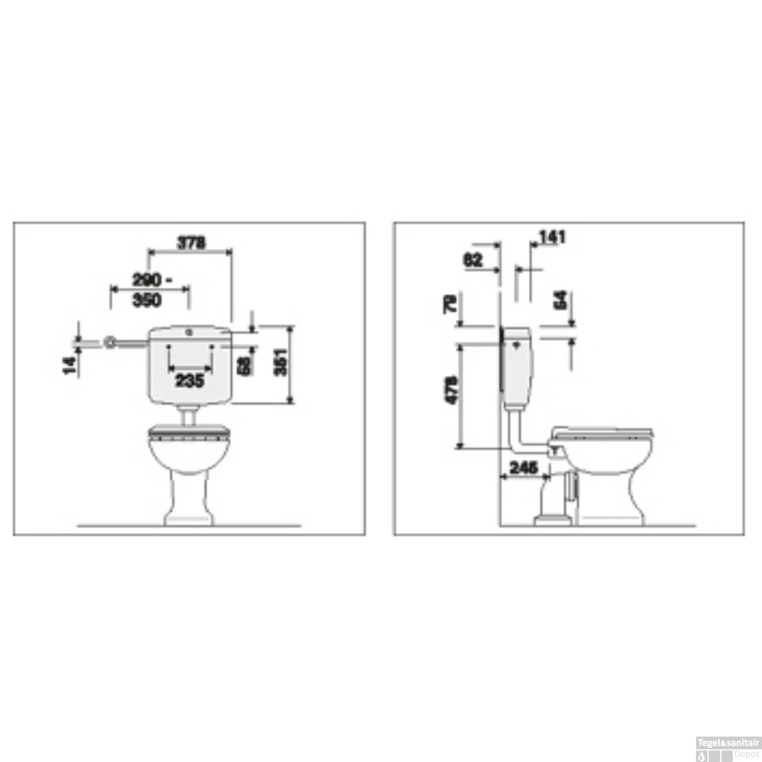De hoogte van dit reservoir is 35,1 cm, de breedte is 37,8 cm en de diepte is 14,1 cm.